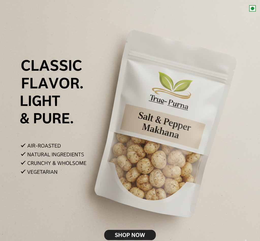 True-Purna Salt & Pepper Makhana is crafted for those who appreciate simple, honest taste. Carefully selected premium fox nuts are hygienically roasted — never deep-fried — and delicately seasoned with balanced salt and pepper for a clean, satisfying crunch.